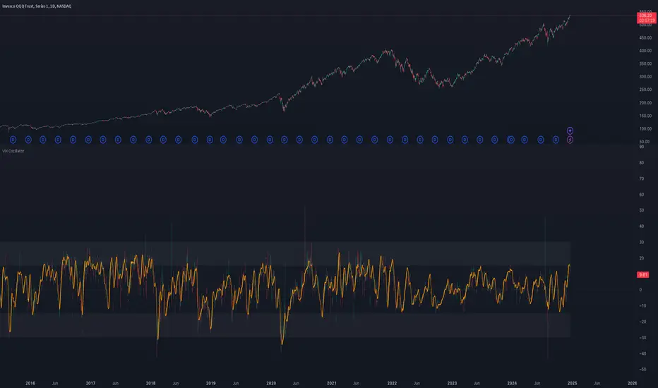 Plots an oscillating value as a percentage, derived from the VIX and VIX3M. This can help identify broader market trends and pivots on higher time frames (ie. 1D), useful when making swing trades.