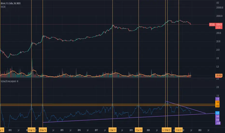 Designed for Bitcoin. Plots the log of the close/20W SMA with a linear offset m*t, where m is the gradient I've chosen and t is the candle index. Anything above 1 is a mania phase/market cycle top. If it peaks around 0.92 and rolls over, it could be a local/market cycle top.