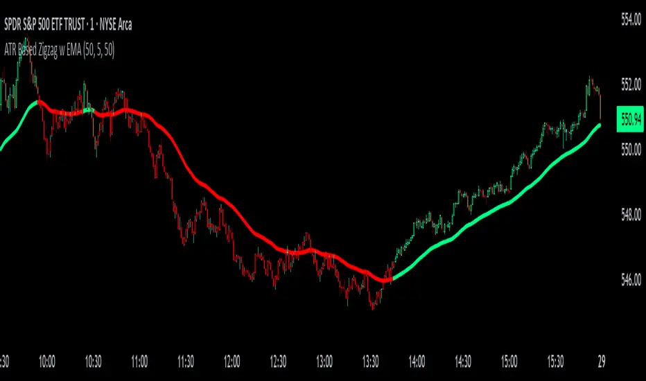 The "ATR Based Zigzag with EMA" indicator is a refined trend-following tool designed for traders who demand clarity, precision, and robust trend detection. This script uses an ATR (Average True Range)-based breakout mechanism to dynamically determine the current market trend, while overlaying a clean, smoothed EMA (Exponential Moving Average) line to visually represent the active directional bias.