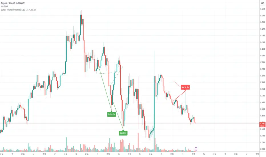 This indicator detects bullish and bearish divergences by analyzing price action, volume trends, and RSI (Relative Strength Index) for added confirmation. It highlights key market reversals or trend continuations by identifying when price movement diverges from volume dynamics, providing traders with actionable insights for entry and exit points.
