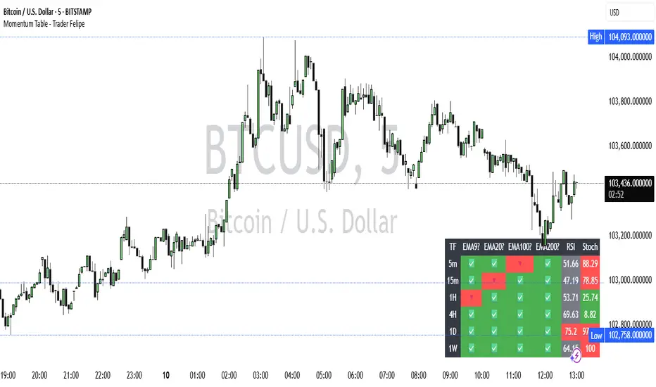 Multi-Timeframe EMA, RSI & Stochastic DashboardThis indicator displays a compact, color-coded table showing the status of key technical indicators across multiple timeframes (5m to 1W). It includes: