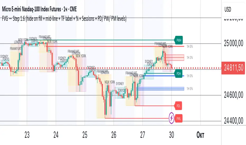 • Perfect for strategies that rely on confluence of FVG + session highs/lows + PDH/PDL.