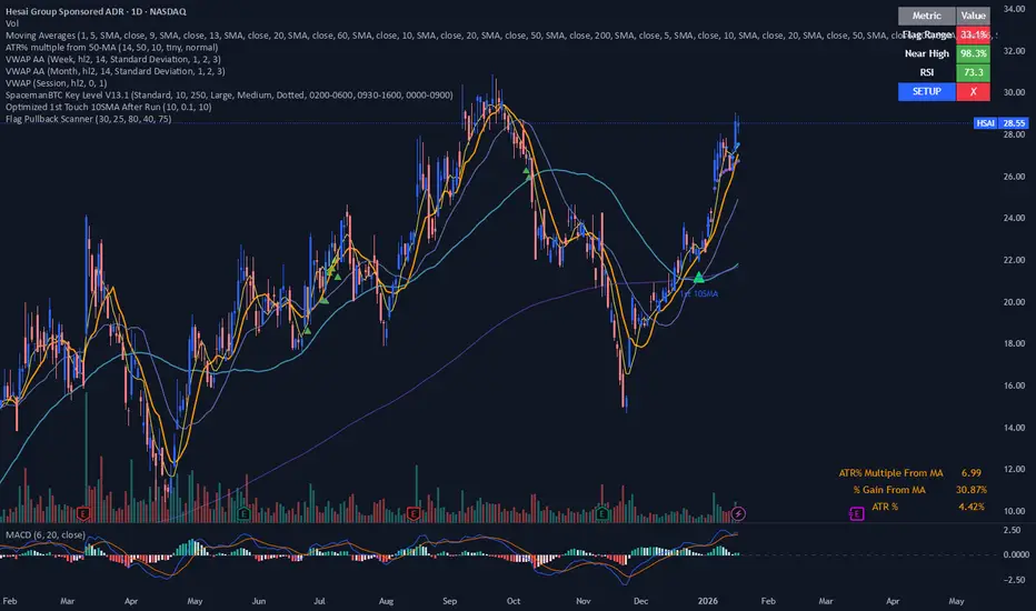 Identifies flag pullback setups by scanning for stocks with prior strength (40%+ gains over 60 days), tight consolidation near highs, and healthy uptrend confirmation. Green candles mark valid setups ready for breakout. Built for swing traders seeking high-probability continuation patterns with defined risk.