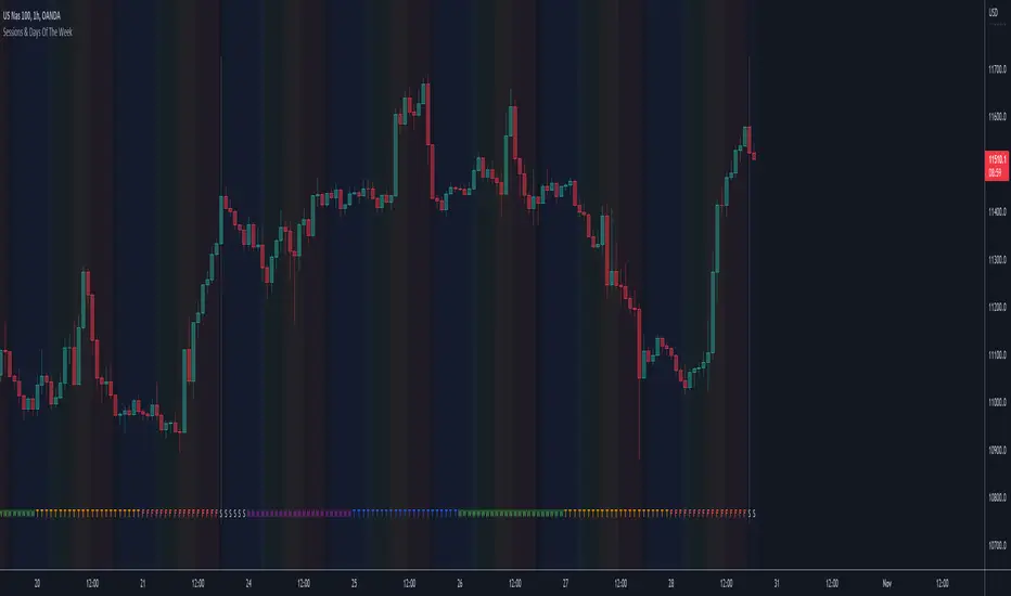 Traders tend to focus their energy on specific sessions or time periods. This indicator will plot the days of the week, and also highlight the following sessions: Frankfurt (2:00am - 11:00am EST), London (3:00am - 12:00pm EST), New York (8:00am - 5:00pm EST), Sydney (5:00pm - 2:00am EST), Tokyo (7:00pm - 4:00am EST).