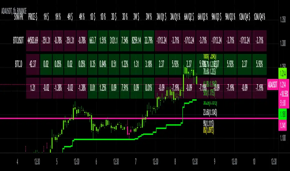 A Simple Crypto Dashboard/Screener which indicates the Price and percentage changes for the Given Period of time i.e for 1 Hr ,4 Hrs , 1 Day, 3 Days, 3 Weeks and 3 - 12 Months. By Default it displays #BTC and its Dominance and current trading pair Price and % changes.Open-source script