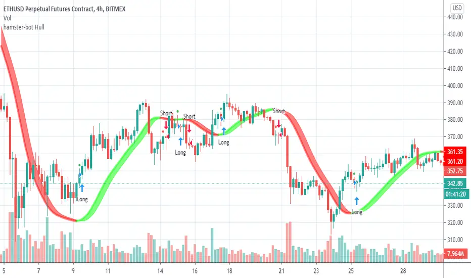 This is a trading strategy on the Hull Suite indicator. 3 Hull variations: HMA, THMA (3HMA), EHMA. The strategy is always in position according to the trend of the indicator.