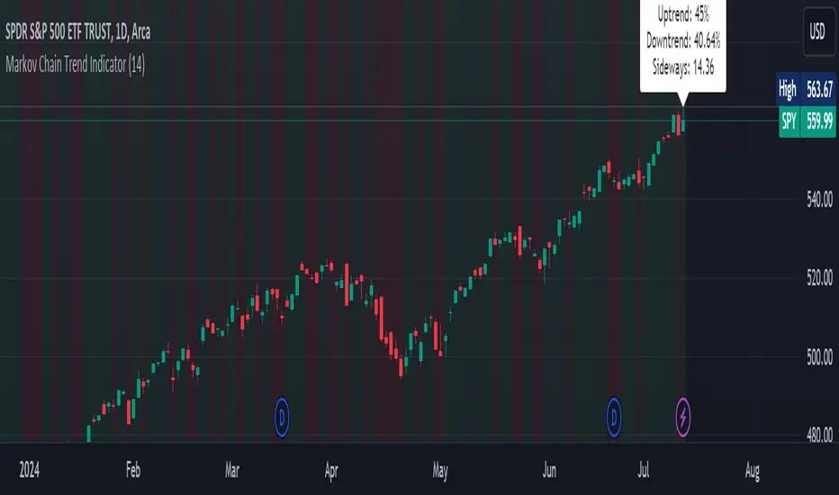 The Markov Chain Trend Indicator utilizes the principles of Markov Chain processes to analyze stock price movements and predict future trends. By calculating the probabilities of transitioning between different market states (Uptrend, Downtrend, and Sideways), this indicator provides traders with valuable insights into market dynamics.