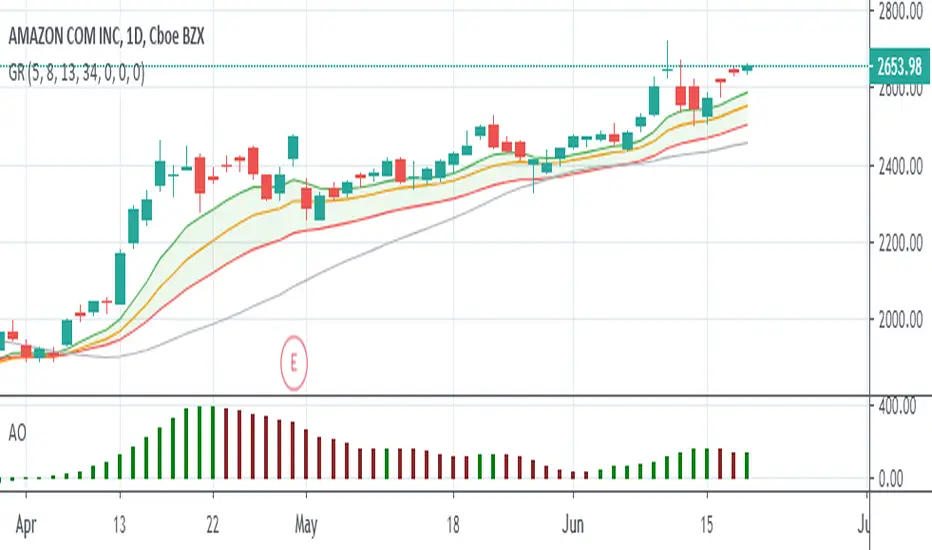 Astute observers will notice a fourth line has been added at 34 SMA. It's a bit of a cheat. 34 SMA is the zero line of another classic B. Williams indicator, the Awesome Oscillator. When the green line crosses over 34 SMA, it's quite likely the Awesome Oscillator will have changed sentiment as well. It also makes a nice loose trailing stop loss reference if you're hoping to get into some long trends.