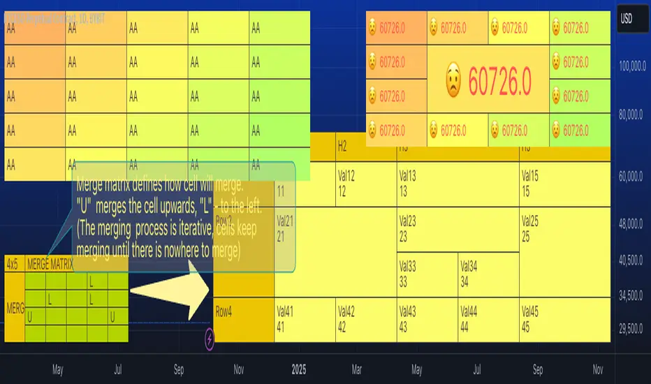 Merging of the cells is controlled with a special matrix of "L" and "U" values which instruct a cell to merged with the cell to the left or upwards (please see examples in the script and in this description).