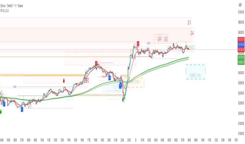 - Overlapping Zone Signals: Fibonacci retracement (0.328~0.618) + extension (2~2.618); other overlapping signals are optional.