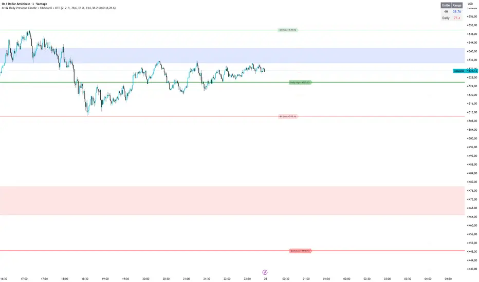 This Pine Script v5 indicator is designed for traders who utilize **Optimal Trade Entry (OTE)** zones and **Fibonacci retracements** based on higher timeframe market structures. It automatically identifies and plots key levels from the previous 4-hour and Daily candles to help find high-probability reversal zones.