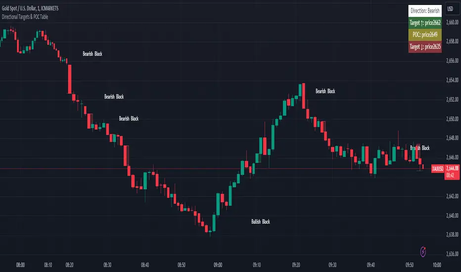 The "Directional Targets & POC Table" Pine Script™ is a comprehensive tool designed to help traders identify directional bias, potential price targets, and important levels like the Point of Control (POC). Additionally, it detects fair value gaps (FVGs) and order blocks, which are crucial concepts in Smart Money Concepts (SMC) trading. Here's an overview of its functionality: