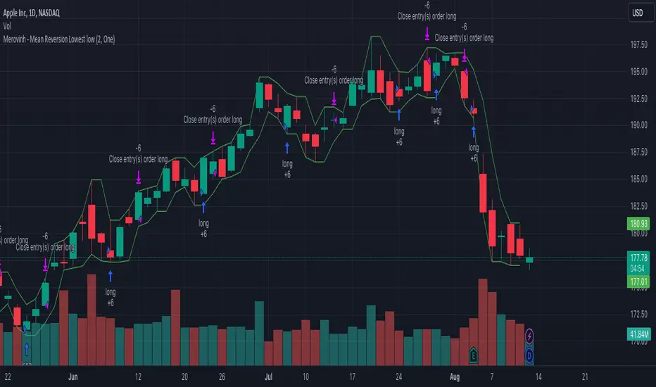 The "Merovinh - Mean Reversion Lowest Low" strategy is a mean reversion trading approach that aims to identify potential reversal points based on the updated lowest low of the specified number of bars. This strategy focuses on the detection of bullish price movements. Works well on Tech giant's shares.
