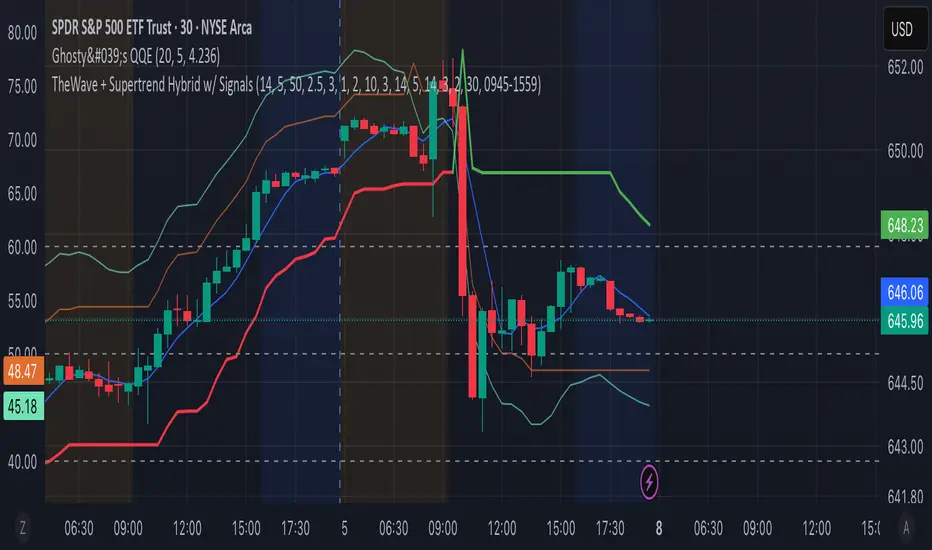 This version makes all entries and exits visually obvious while keeping the hybrid TheWave + Supertrend logic intact.