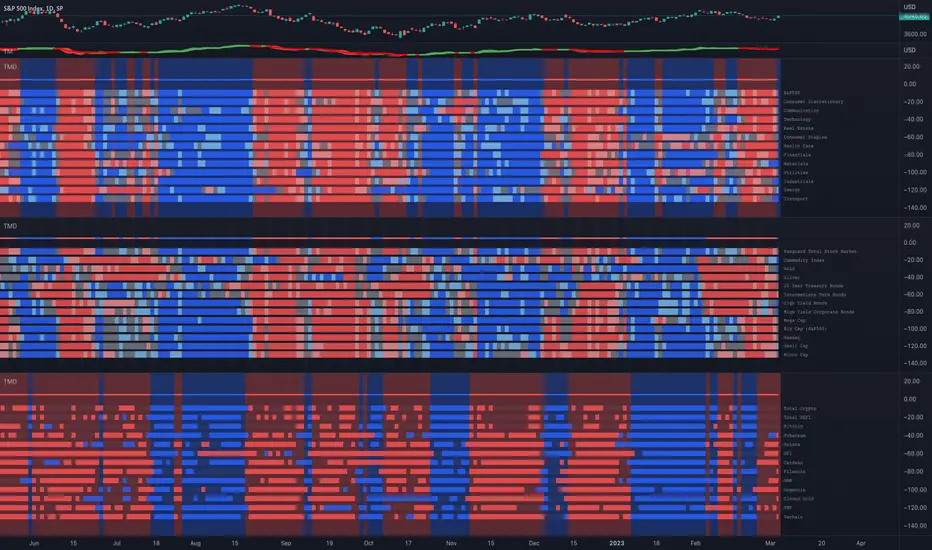a) You can evaluate "long" term trend using day or week timeframe. e.g. I'm usually trading only long and stay out of the market when it is not bullish (top line & background = blue). I'm also using it to know which segments/assets are currently "hot".