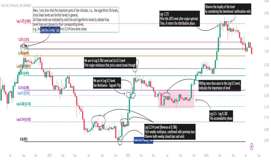 Fibonacci levels are a technical analysis tool used by some traders to identify potential support and resistance levels. The principle for determining these levels is to take the distance between selected reference high and low points (swing high and swing low in general) as 1 unit and mark the ratios derived from the Fibonacci sequence, such as 0.236, 0.382, 0.618, etc., over this 1 unit. In the conventional method of level determination, the 1 unit is divided into equal distances within itself, and Fibonacci levels are determined based on these equal distances. These types of levels are called Linear Levels. A relatively less common method involves dividing the 1 unit into progressively smaller, more accurately described as proportionally equal, distances and determining Fibonacci levels based on these distances. These types are called Logarithmic Levels. The purpose of this indicator is to provide ease of use in determining both Linear and Logarithmic levels.