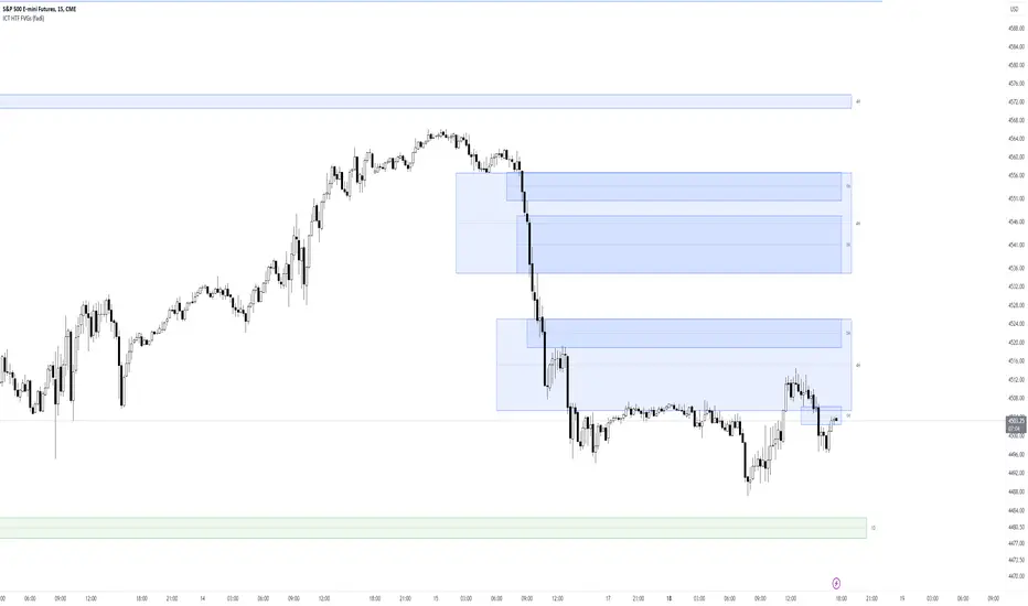 ICT HTF FVGs displays the higher timeframe FVGs on current chart. This allows the trader to easily visualize the higher timeframe FVGs without having to mark them manually and see when price reaches point of interest for possible reversals or reaction.