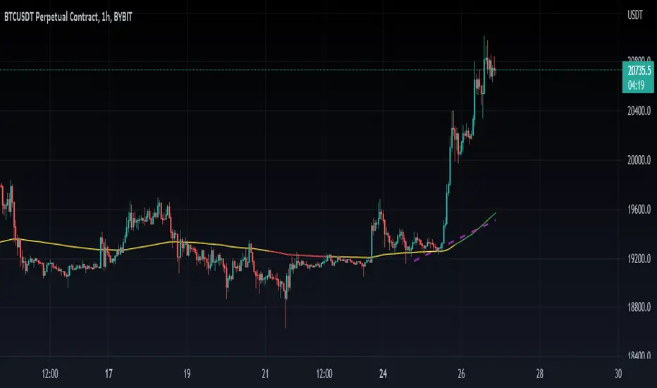 The gradient of this line of best fit is then compared to the gradient of the line of best fit over a range of previous candles. If the absolute value of the EMA gradient is greater than 75% (configurable) of the set of previous gradients then the line is coloured green for positive gradients and red for negative gradients. A yellow line indicates that the gradient is lower than the threshold.