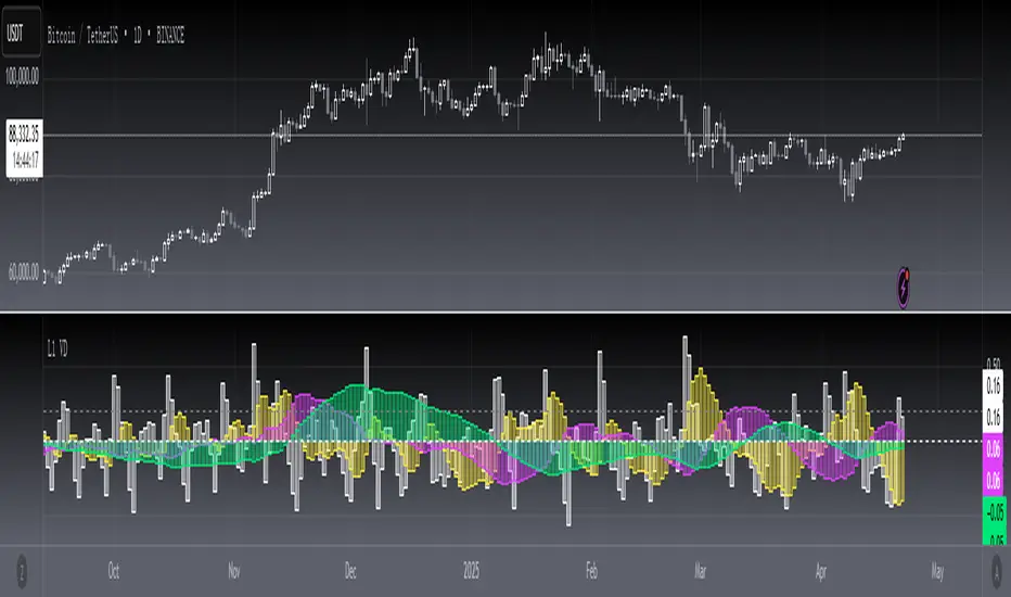 OVERVIEWThe L1 Volume Dynamics indicator analyzes market volume patterns using a sophisticated combination of Jurik Moving Average (JMA) and Adaptive Moving Average (ALMA). This script creates visual representations of different timeframes' volume behaviors through columns and steplines, helping traders identify potential buying and selling opportunities based on volume trends.