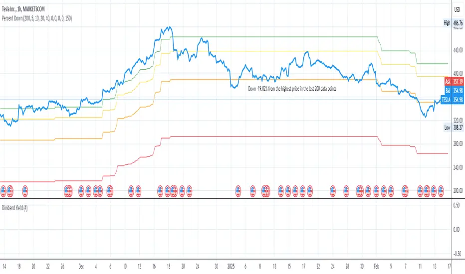 The percent down from the most current 52-week high will be shown as a percentage down on the chart to see you how much the current price is down from the most recent high price.