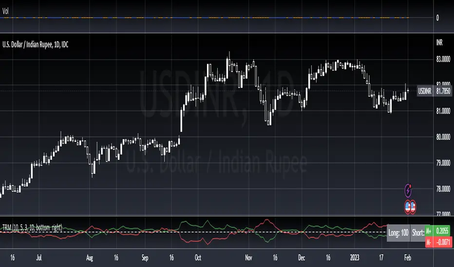 The simplest way to use the indicator is to take a long position when the M+ line crosses above the 0 line. Similarly, to short, the M- line should cross above the 0 line. The exit would be when the respective line crosses below the 0 line.