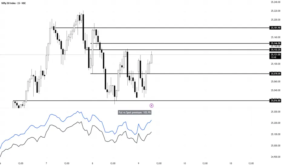 This indicator compares Nifty Spot and Nifty Futures prices in real-time, displaying the premium (or discount) between them at the top of the pane.