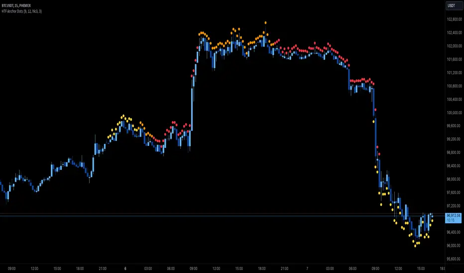 High Time Frame Anchor Dots is designed for traders who use the 15m or 1H chart and want a clear visual of higher-timeframe momentum conditions without constantly switching timeframes. The script builds on the Wave Anchor Indicator concept and is intended to complement the TP Mint Trading Strategy.
