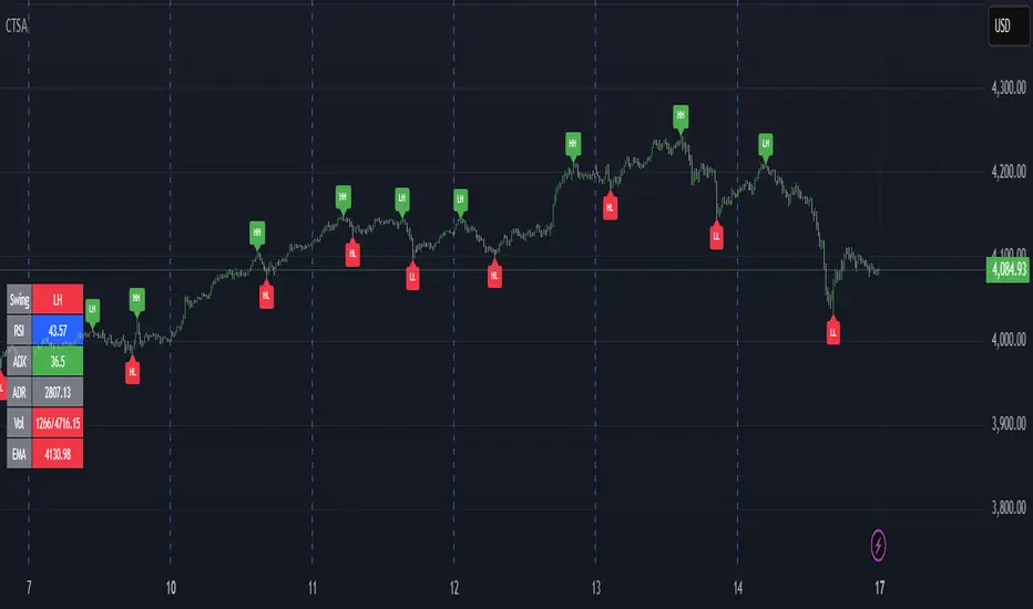 The dashboard provides an at-a-glance view of market conditions including trend status, swing type, RSI, ADX, volume strength, EMA bias, and ADR levels.