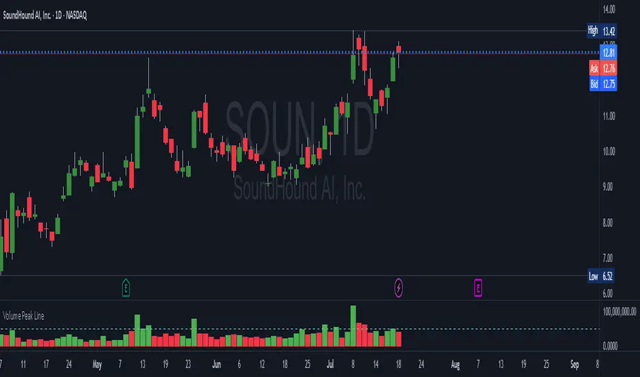 A fully configurable “Volume Peak Line” indicator that draws a horizontal threshold at the highest volume over the last X candles (default 5).