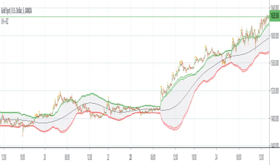 Underworld Hunter + Base Zone is designed to keep traders out of ranging markets by establishing a "dead zone" between the bands where price may be choppy or trends may be short lived. The original Underworld Hunter from @greenmask9 adapted Bollinger Bands by changing the basis from SMA to the EMA of the EMA of the EMA. This version now allows the user to select which moving average they would like to utilize for the calculation.