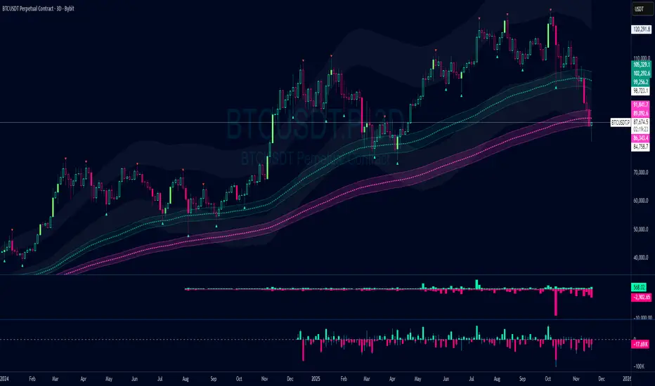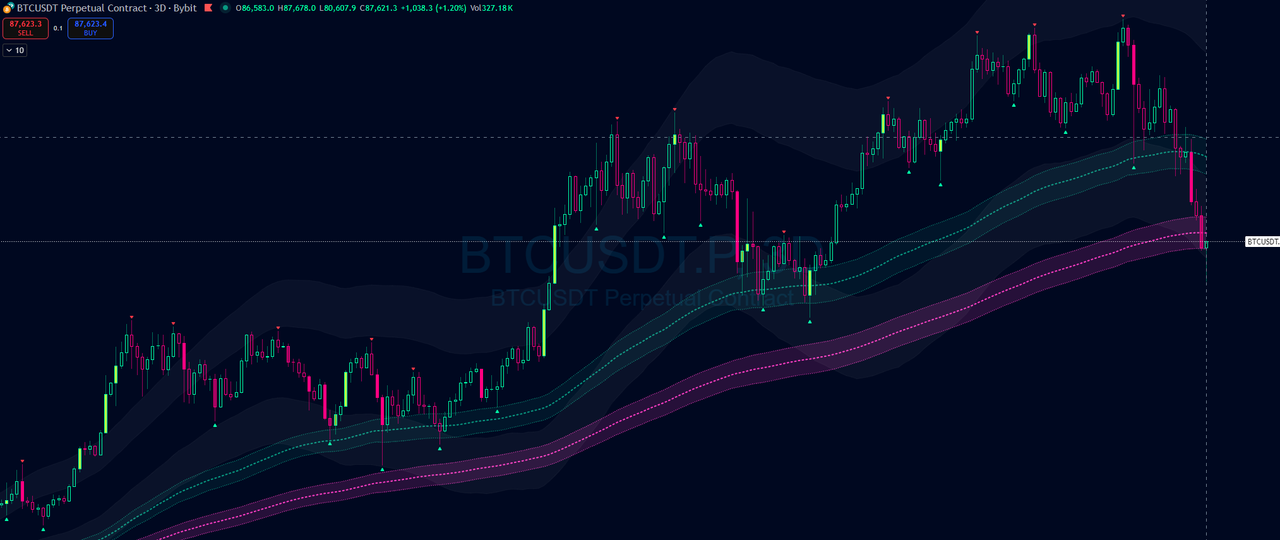 I find on a 3-Day chart on BTC the 100 EMA is great for telling what trend we're are in.