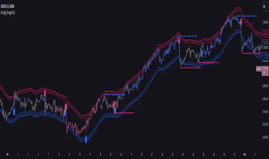 The Market Structure Algo V2 (MS Algo V2) is an advanced TradingView indicator developed by OmegaTools to provide traders with a comprehensive analysis of market structure. This tool refines the insights provided by its predecessor, combining enhanced pivot point analysis, dynamic market structure scoring, and zone visualization to deliver an intuitive view of potential market movements. Through custom settings, the MS Algo V2 allows users to tailor the indicator to fit their trading strategies more closely, offering enhanced adaptability to both short-term and long-term trends.