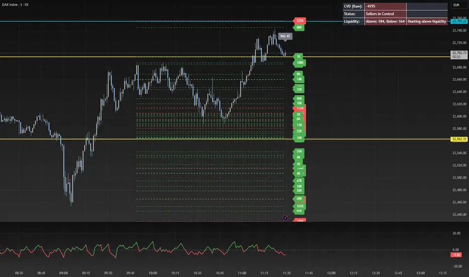 The CVD Oscillator - Short Term is a technical indicator designed to assist traders in identifying short-term buying and selling pressure in the market. It calculates the Cumulative Volume Delta (CVD) to measure the net volume difference between buying and selling activity, displayed as an oscillator in a separate panel. This indicator is tailored for short-term trading strategies, such as scalping or day trading, on low timeframes (e.g., 1-minute, 5-minute, or 15-minute charts).