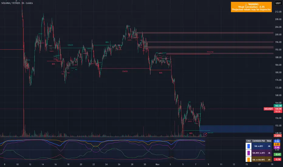 Variant of LuxAlgo Smart Money Concepts that allows you to choose a reference symbol that has a strong correlation with the current asset (e.g. corr(SOL/USDT, USDT.D) = -0.9). The indicator performs a simple linear regression and maps the key levels from USDT.D (or any other chose asset) on the current candle pane.