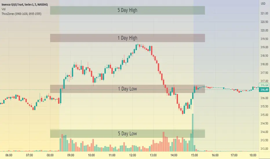 This indicator is a formula that includes 4 different zones which are different sizes based on the ticker you decide to use. It was optimized for SPY and other market ETFs but works well for all stocks on the market. The formula puts a zone at the previous day's high and low, and the previous 5 day's high and low. These zones are meant to be used as support and resistance and can even overlap, creating a 'master zone'. This is different than other zone indicators because the formula for these zones is something I created myself and have been unable to find on here. I have had the most success using a 1-15 minute chart and using my zones for reversal areas. I often look for other indications of reversal as well that line up with the area of the zones. It can also be used on the break and retest of these zones. I have found that when a stock breaks one of these zones it will often retest and continue that trend.