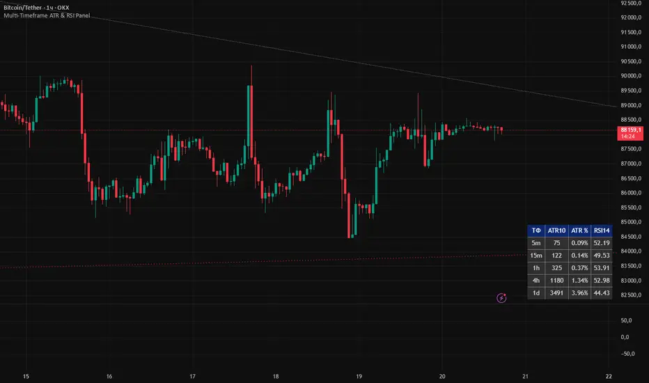 This indicator is designed to summarize information across popular timeframes for one of the most widely used and essential indicators — ATR and ATR% — presented in a table format.