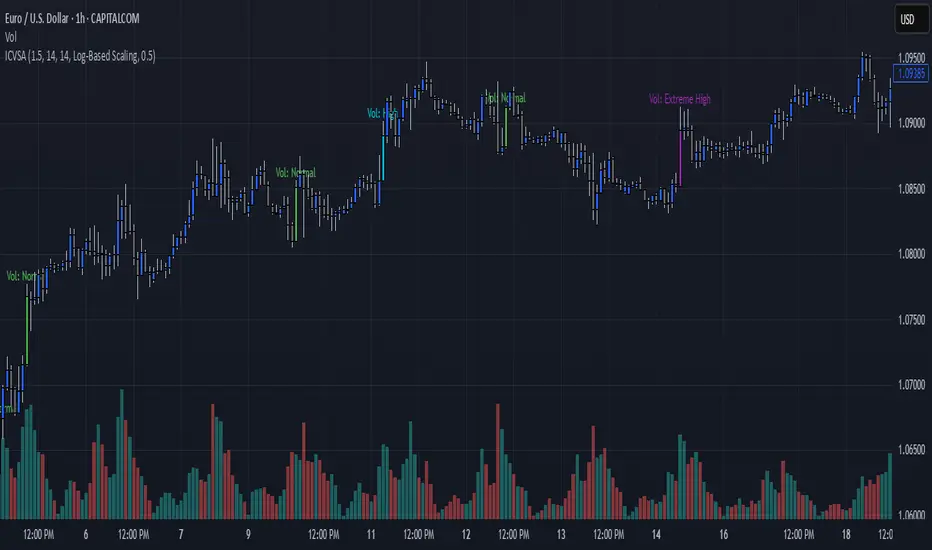 Log-Based Scaling: Uses a logarithmic function to adjust the expected volume based on how the current candle’s body size compares with the ATR, moderated by a scaling factor (alpha).