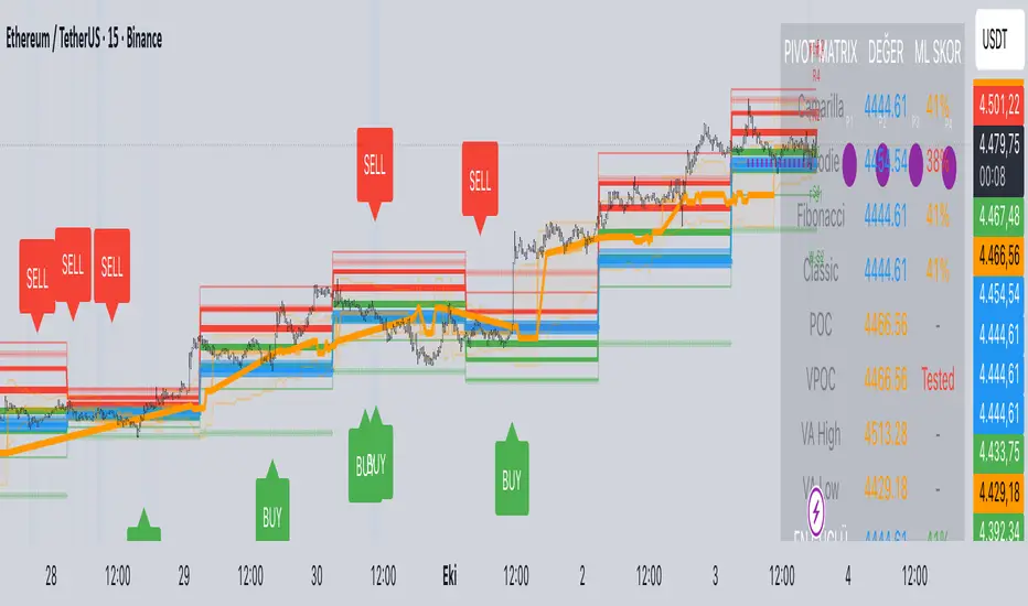 OHLC data, integrates volume profile for POC/Value Area tracking (including virgin POC), applies rule-based "ML" scoring to evaluate pivot strength via factors like proximity, volume, touches, trend, and confluence, monitors adaptive success rates, projects 5-day future pivots using trend/volatility, detects overlapping confluence zones, and generates visuals (lines, labels, table), alerts, and buy/sell signals on key crossings.