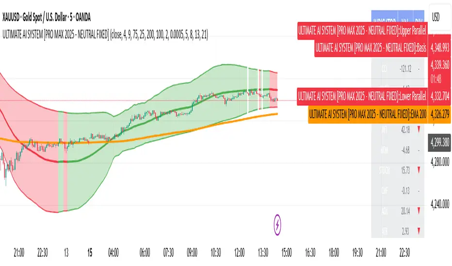 The ULTIMATE AI SYSTEM [PRO MAX 2025] is a next-generation trading toolkit designed to identify high-probability reversal setups within established trends. This Parallel Edition introduces a dynamic Linear Regression Channel combined with a powerful Multi-Divergence Engine capable of scanning 14 different oscillators simultaneously.