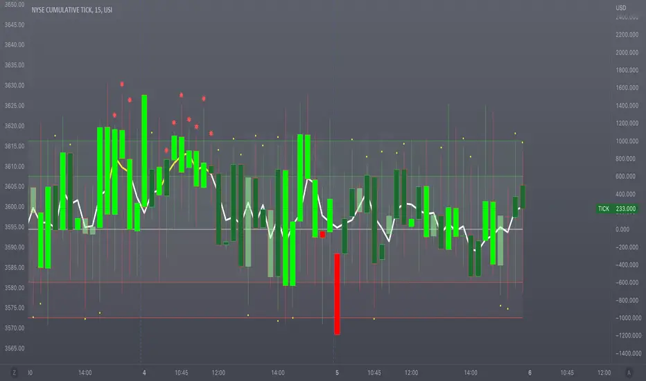 I built this indicator for the 5 min, 1 day TICK Index chart on my Dashboard chart layout where I keep my helpful market internals charts and have been asked to make it available on TradingView. I'm making it available for a small premium to cover maintaining updates & improvements.