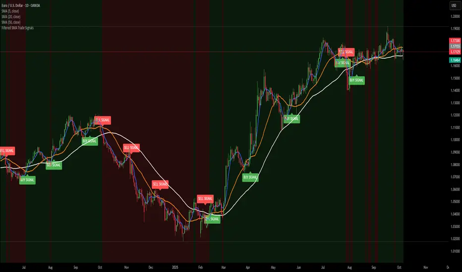 SMA Trade Signals that identifies the point where the 5 moving average close below the 20 simple moving average. When that happen label TRADE SIGNAL. Also identifies the point where the 5 simple moving average closes above the 20 simple moving average label that TRADE SIGN