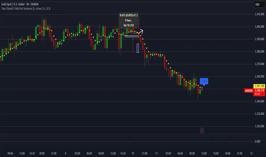 I created this indicator for XAUUSD 30 minute chart. Do with as you see fit. The indicator has a function that you can assign a MAX and MIN variance of the 5 MA right down to 0.10 cents. If closing value of 5 MA is within your set amount an ALERT is given. The actual variance is given in the leading flag and is of the prior 2 closed values.