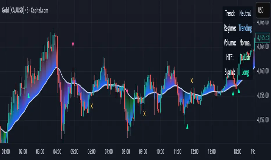 It blends multiple concepts—trend direction, volatility, volume behavior, higher-timeframe bias, and a smooth neon-gradient ribbon—into a single, readable structure.
