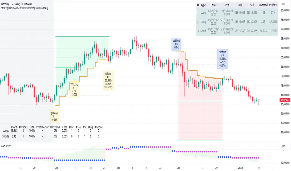 Strategy Development Enviroment: input signal A=Ann Trend Predicted_Trend_Signal, goLong ((A<0)and((A[1])>0)), goShort ((A>0)and((A[1])<0)), Enter Signal delay=0, Exit Signal delay=0, Alternate Trades=true