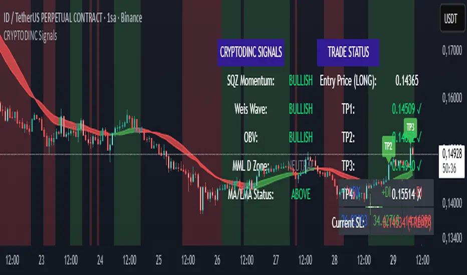 CRYPTODINC Signals is an indicator that generates "Long/Short" signals, which I generated using artificial intelligence tools without any coding knowledge. This indicator currently consists of eight indicators. It has two different timeframe combinations, and the signals come from the 1-hour timeframe.