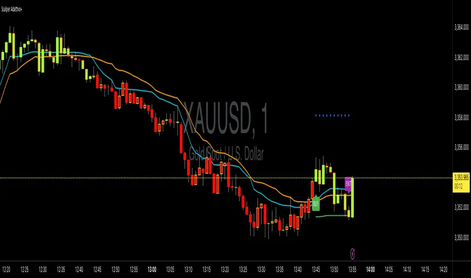 This is a comprehensive and adaptive trading system designed specifically for scalping XAUUSD (Gold) on a 3-minute timeframe. Its main feature is that it "adapts" to current market conditions rather than using fixed parameters. It provides clear BUY, SELL, and EXIT signals directly on the chart.