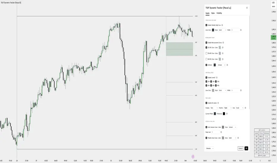 Weekly map for intraday charts (≤60 min). It anchors the current week’s high/low, then tracks where price is retracing into the week so you can frame entries, targets, and risk quickly.