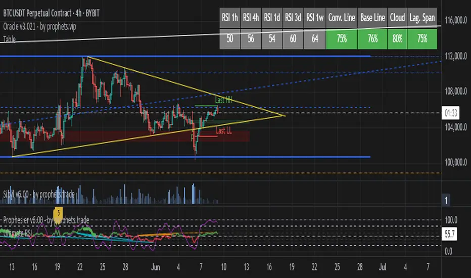 This indicator displays whole-number RSI values (1h, 4h, 1d, 3d, 1w) and Ichimoku strengths (Conversion Line, Base Line, Cloud, Lagging Span) in a customizable table. Toggle between horizontal (9x2) or vertical (2x10) layouts, with adjustable position (e.g., Top Right), text size (Tiny to Large), and colors (border, header, text, RSI: >70 red, <30 green, 30-70 yellow; Ichimoku: >50 green, <50 red). Ichimoku components are plotted on the chart. It offers a clear view of momentum and trend strength for traders.