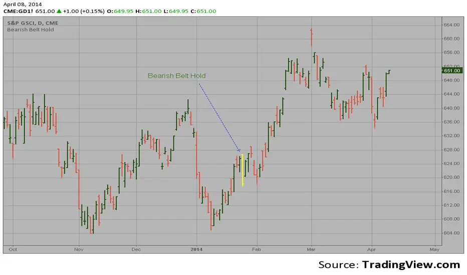 The Bearish Belt Hold is a long down candlestick in an uptrend which opens