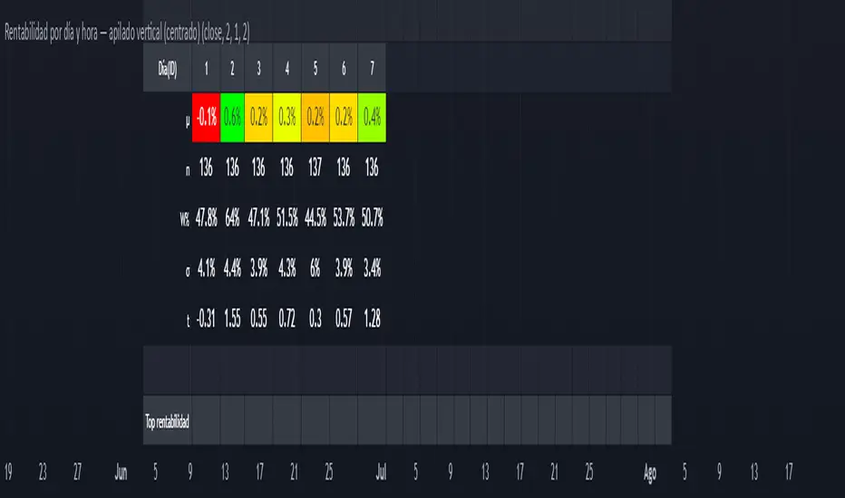 Daily aggregation (no look-ahead): day statistics are computed from completed daily closes via a higher timeframe request. Yesterday’s daily close vs. the prior day is added to the appropriate weekday bucket, preventing repaint/forward bias.